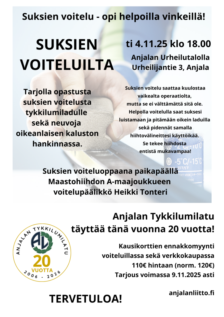 Tiistaina 4.11. 2025 Anjalan Urheilutalolla järjetetään Suksien Voiteluilta klo 18.00 alkaen.